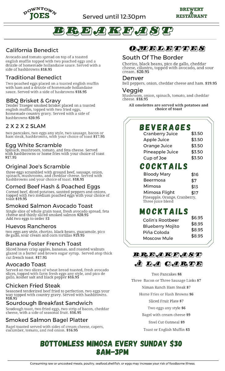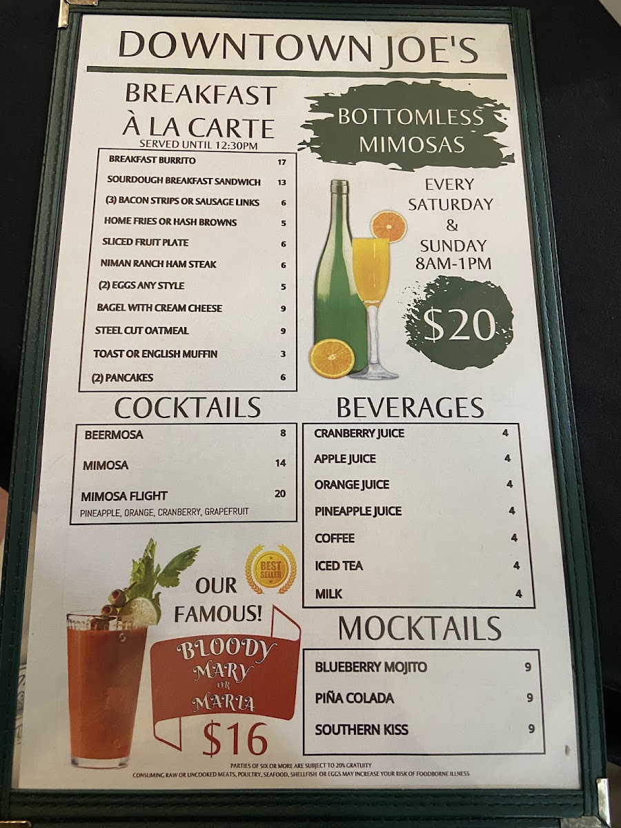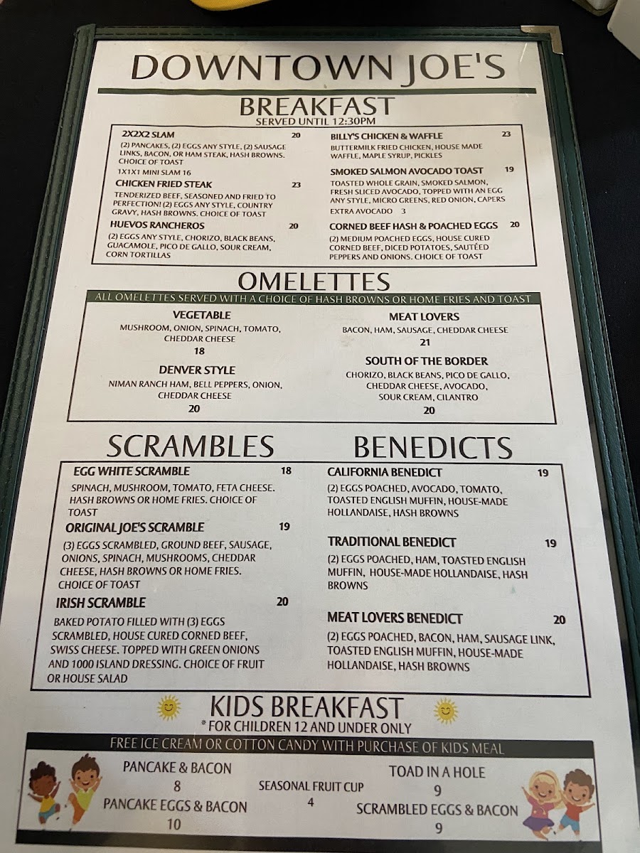 Downtown Joe's is particularly celebrated for its diverse menu that caters to everyone’s breakfast and brunch cravings. Start your day off right with the 2X2X2 Slam, a generous offering featuring two fluffy pancakes, two eggs cooked to your preference, and your choice of savory sausage links, bacon, or ham steak with crispy hash browns, all perfectly accompanied by choice of toast. Or, if you’re in the mood for something else, the Chicken Fried Steak is tender and seasoned to perfection, served with country gravy and again, those delightful hash browns. For a taste of Mexico beyond the borders, indulge in the Huevos Rancheros, bursting with flavor from chorizo, black beans, guacamole, and fresh pico de gallo.